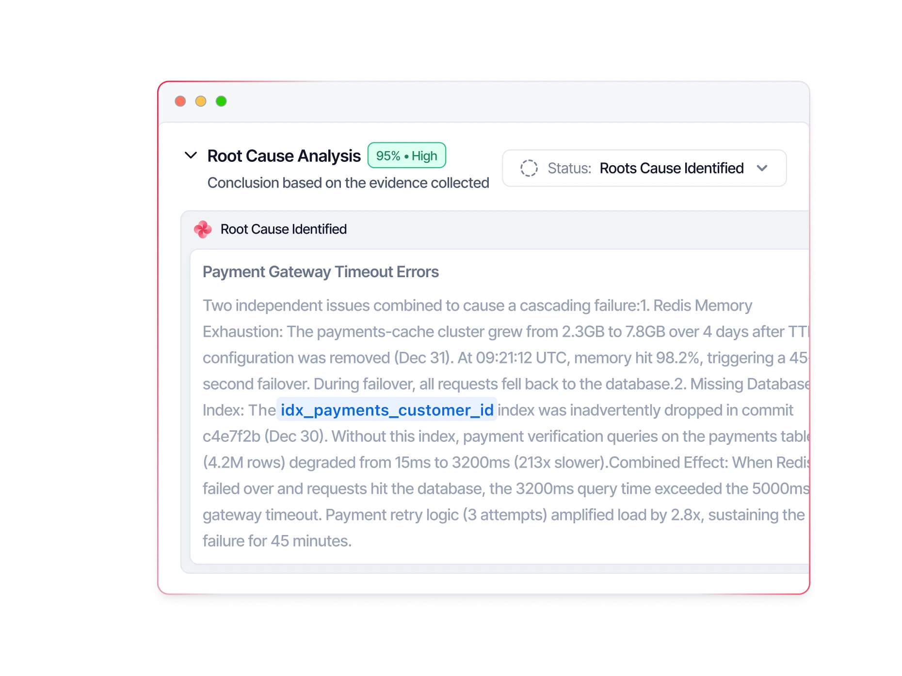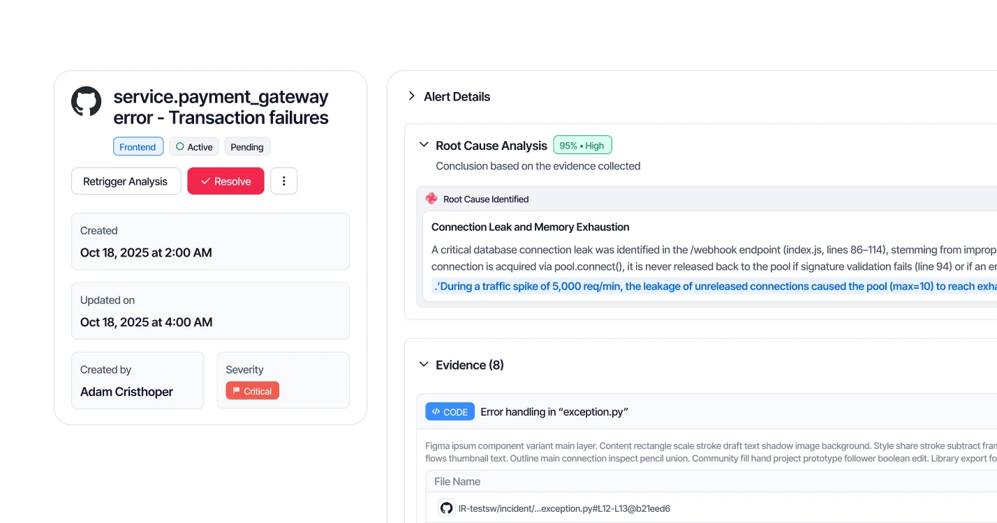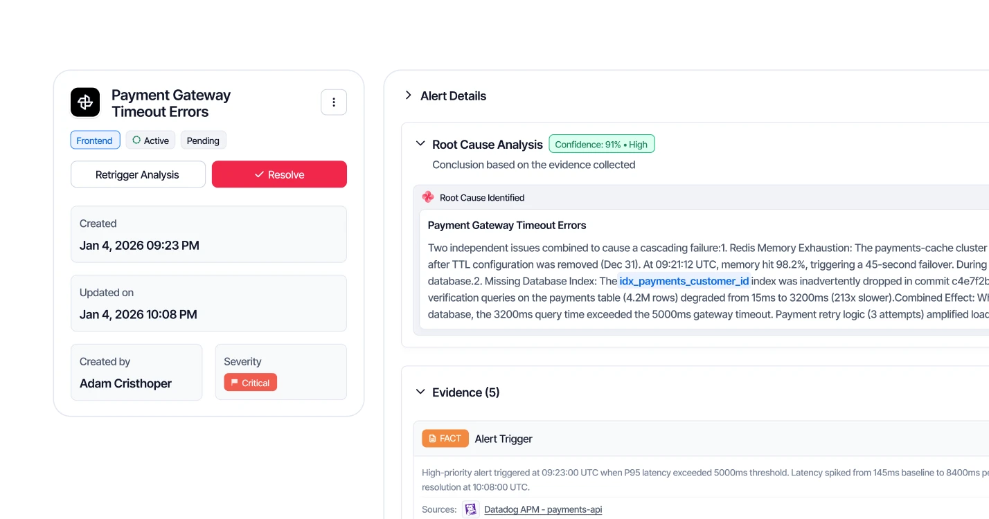 Evidence from across your stack. Fixes ready to approve. Your autonomous on-call teammate.