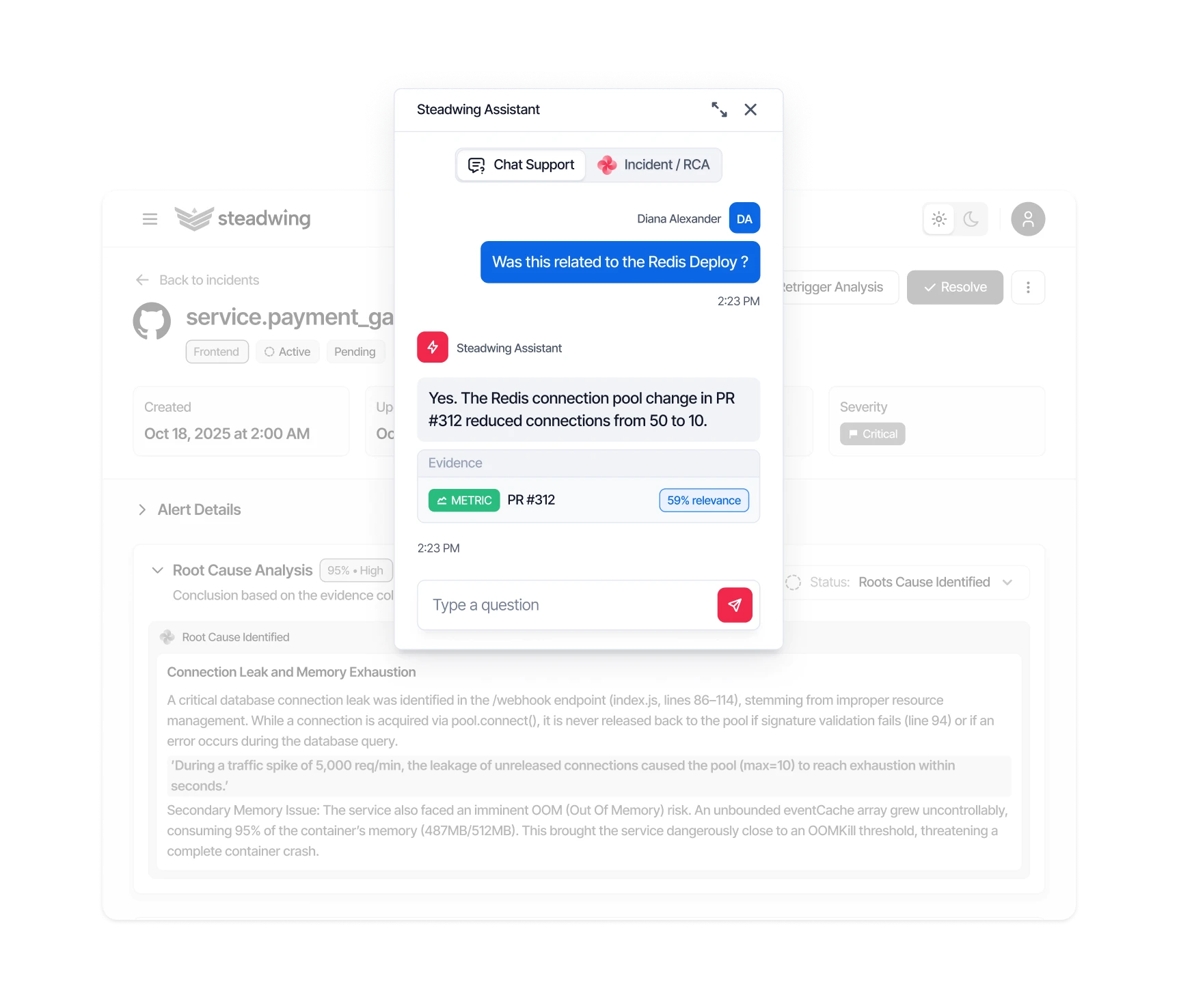 Every incident makes the next one faster. Steadwing learns from your incident history and past fixes — accuracy improves over time. Ask follow-up questions about any incident.