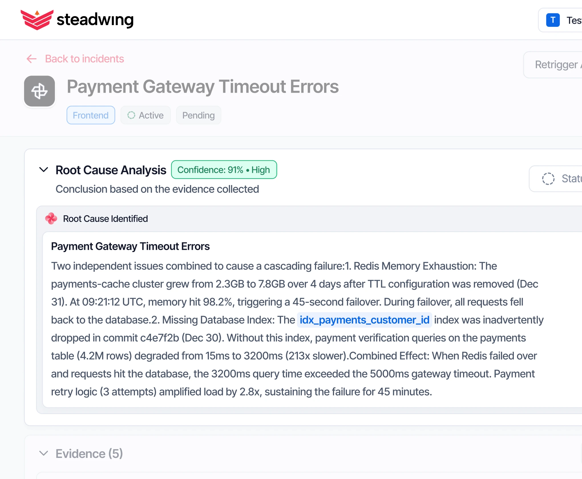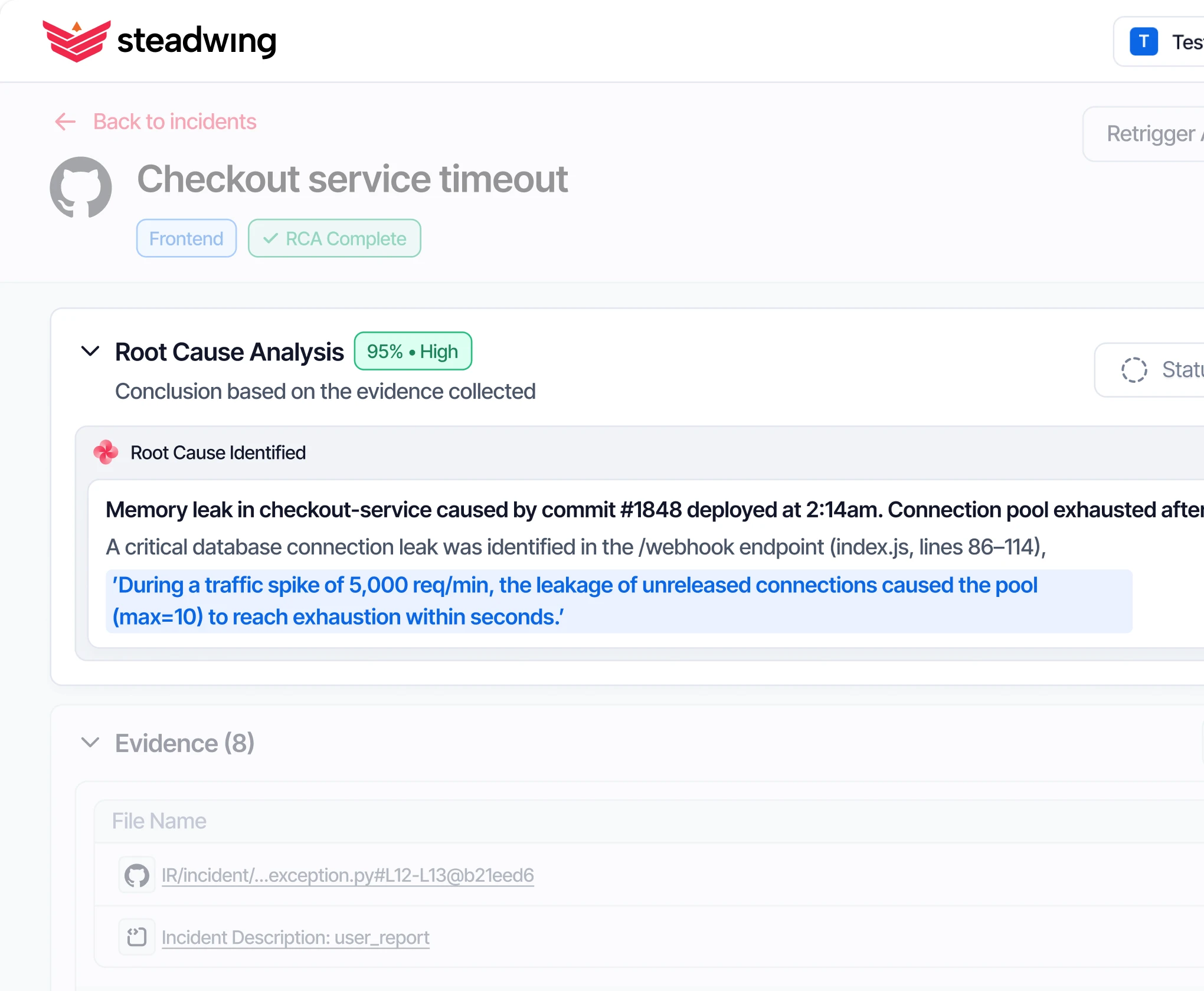When incidents hit, Steadwing correlates all data sources to identify root cause - with evidence.